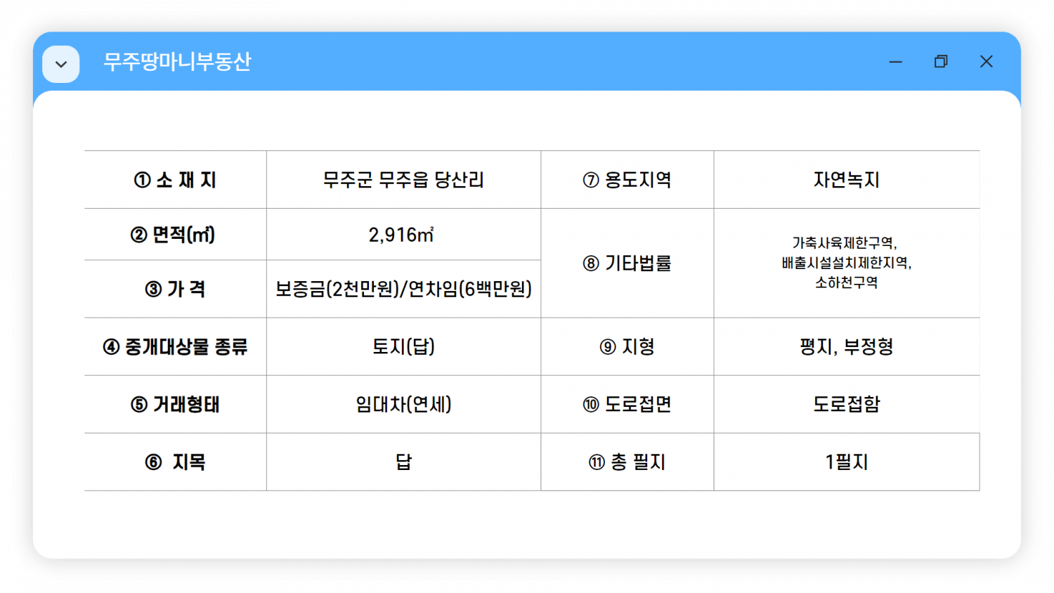 매물 종류 | 토지 | 가격 | 월세 2,000만/50만 |